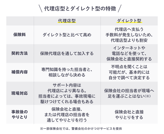 • 代理店型の場合、難しい保険内容も保険のプロである代理店の担当者に相談できるのがメリット。万が一の事故の際も手厚いサポートを受けることができ、ご自身の手間を減らすことができます。