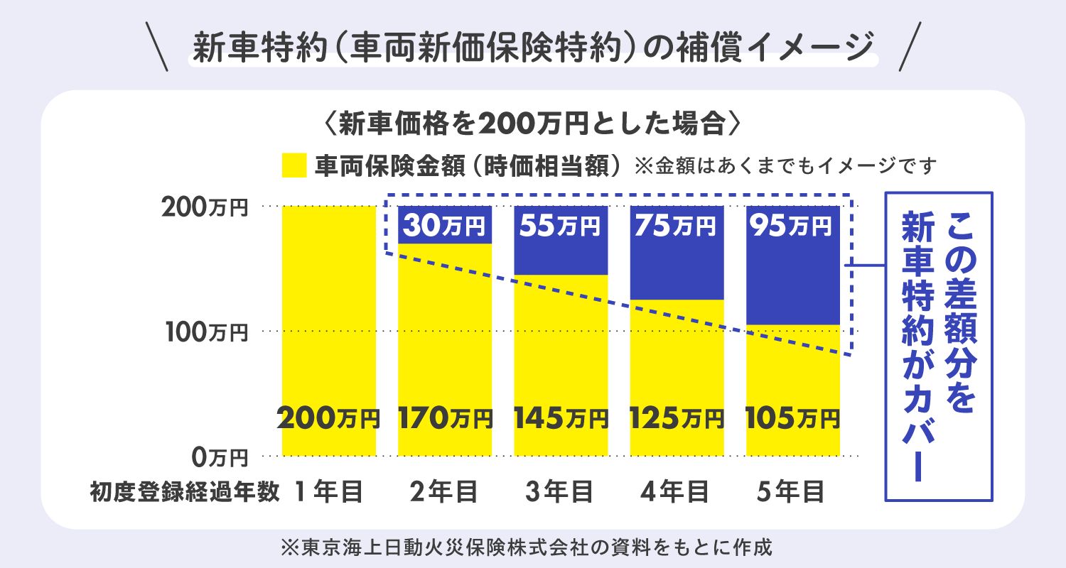 「車両新価保険特約」とは、事故により車に大きな損害が生じた際に新車の購入費用を補償してくれる特約