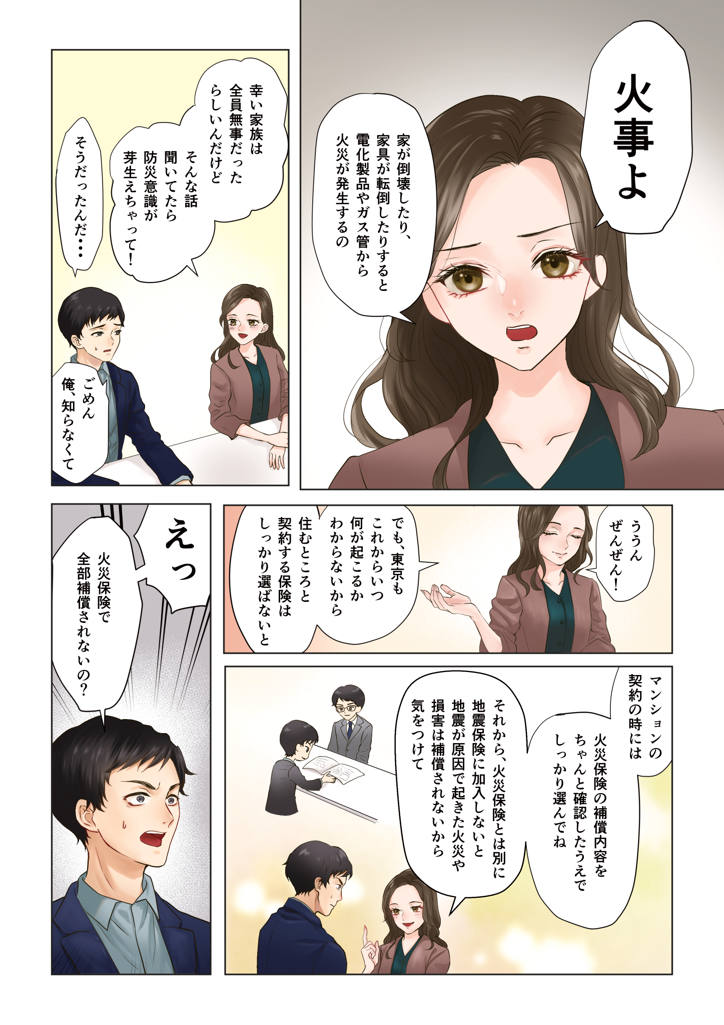 - 地震に備えるためには、火災保険だけでなく、地震保険への加入が必要であることを知っておきましょう。