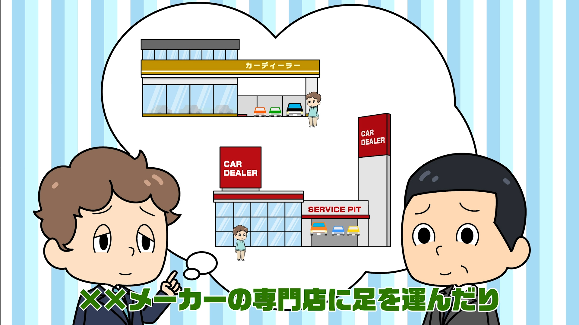 車販、車検、修理、保険、ロードサービス、メンテナンスなどカーライフのお困りごとを一つの窓口で解決できる「街のクルマ屋さん」の「ワンストップサービス」の魅力をご紹介します。今回はどこで自動車を購入するか調べている後輩に先輩がアドバイス。さまざまな車種を取り扱う「街のクルマ屋さん」ならではの魅力を話してくれています。